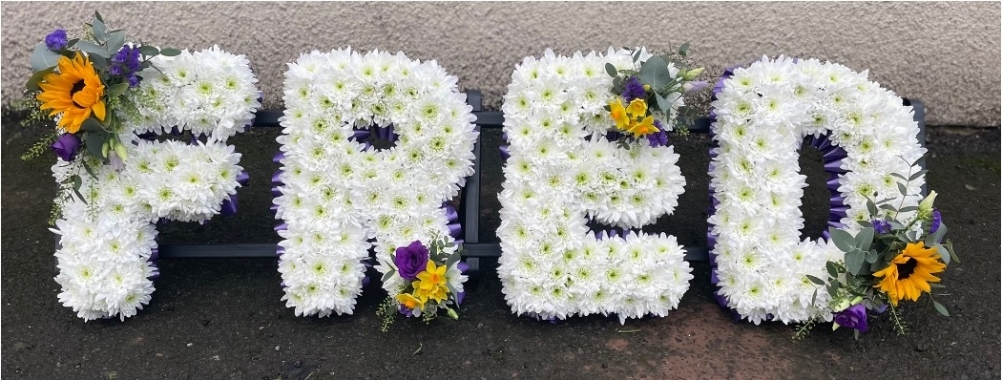 Letters of your choice based in chrysanthemum with a spray colour of choice.