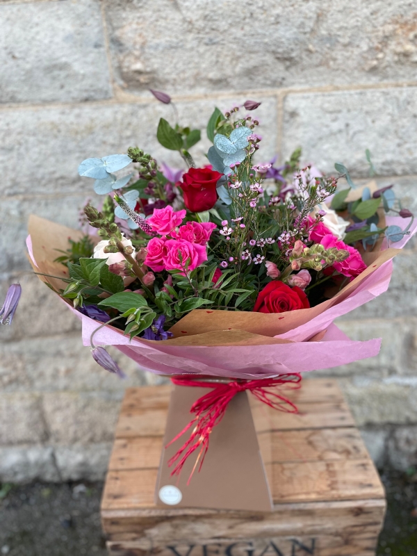 Our Valentine's Florist Choice Bouquet features a stunning mix of the freshest stems in romantic shades of reds, pinks and purples. Hand picked and created by our florists. Gift wrapped in Valentine's paper and finished with luxe ribbon. The flowers will be in a water filled aqua pack to help keep your flowers fresh, and presented in a gift box.