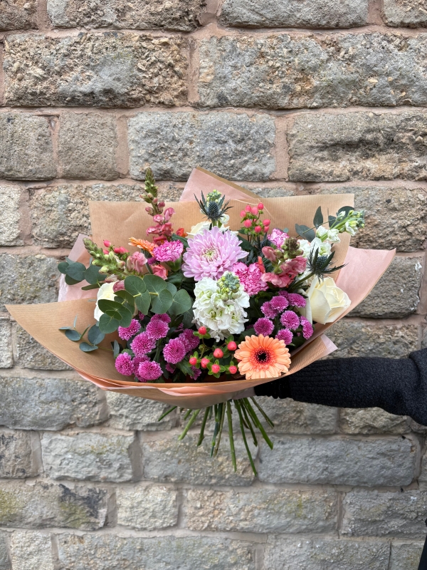 Designed by Jenna, inspired by her beautiful Mum Emma! This bouquet includes a mix of peaches, pinks and creams- cool, quirky and sweet, just like Emma!